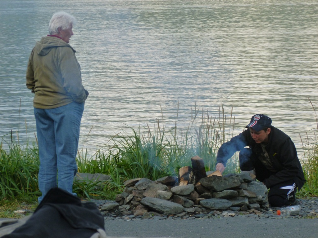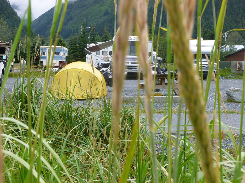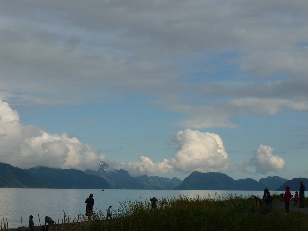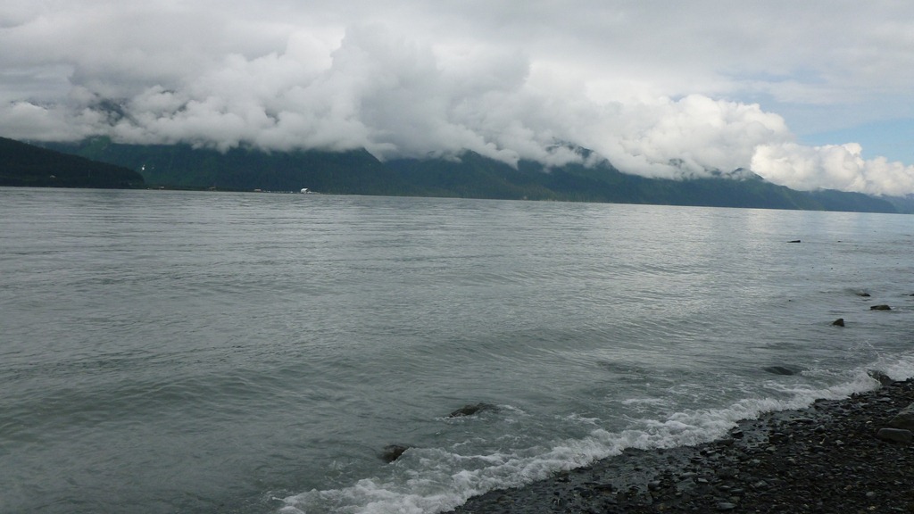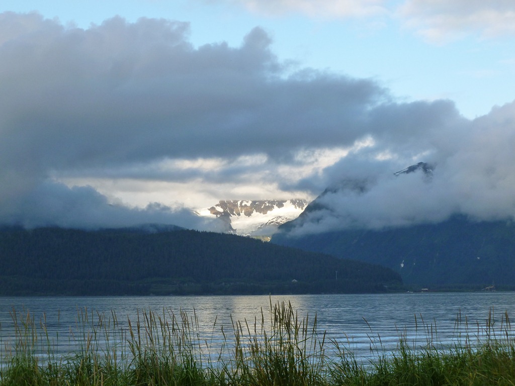 Sure enough we arrive in Seward, light drizzle only and then clears up with some thick clouds around the mountains. Good enough for us. Got a bite to eat and off to a $10 tent site on the water.