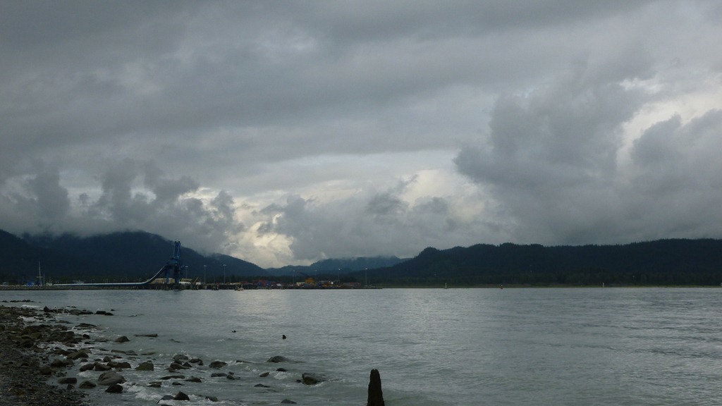We thought about staying at Homer Spit for another night but the forecast was not good. As we packed up the tent the winds really began to blow and the rain started to fall. Seems that way for us, the rain just follows us while we are riding. The tent almost blew away because I took the stakes out while Cheryl was doing something else.