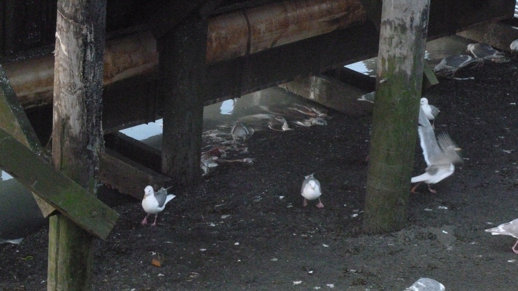 Here is why the gulls and Ravens were making such a ruckus. They were having breakfast from all the left over guts and heads of the fish caught later in the day. There is a cleaning station right about this feeding orgy.