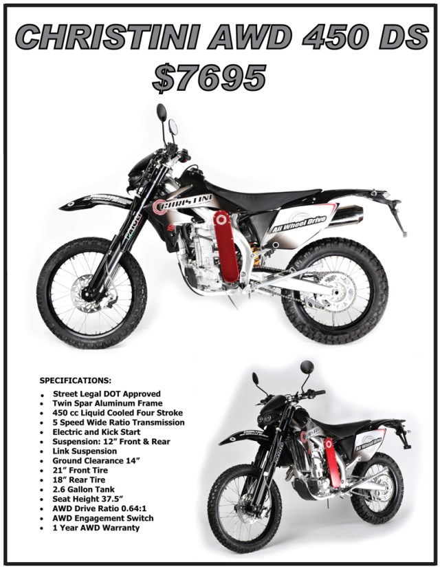 Christini’s patented mechanical All Wheel Drive system delivers power from the motorcycle transmission to the front wheel through a series of chains and shafts. There is no energy-robbing hydraulics involved.
