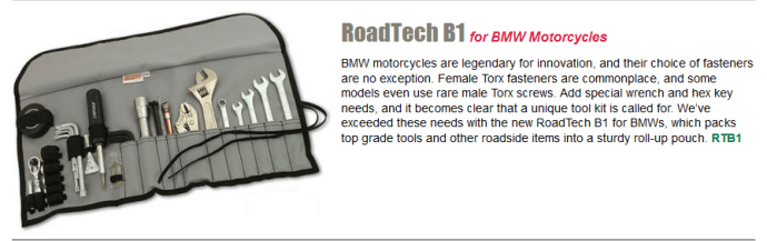 We have learned that the tool kits that come with many bikes just suck. So, we started out our new and improved tool kit for our Beemers with a Cruz Tools kit and have since added many other might need extras from our own garage. We feel the Cruz set up provides a good foundation and the quality of their tools are pretty decent.